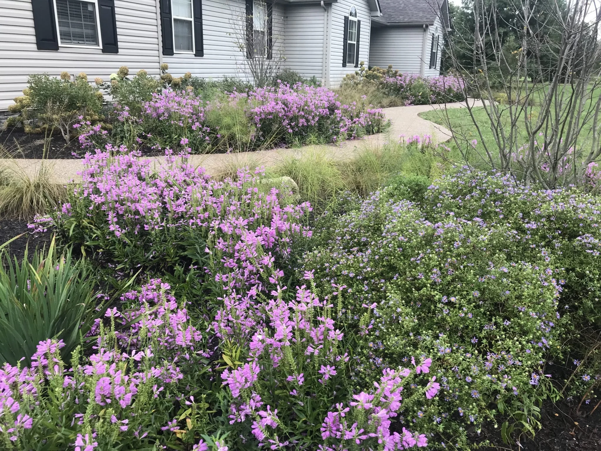As other gardens tend to fade, this garden pops with color thanks to obedient plant, aromatic aster and prairie dropseed.