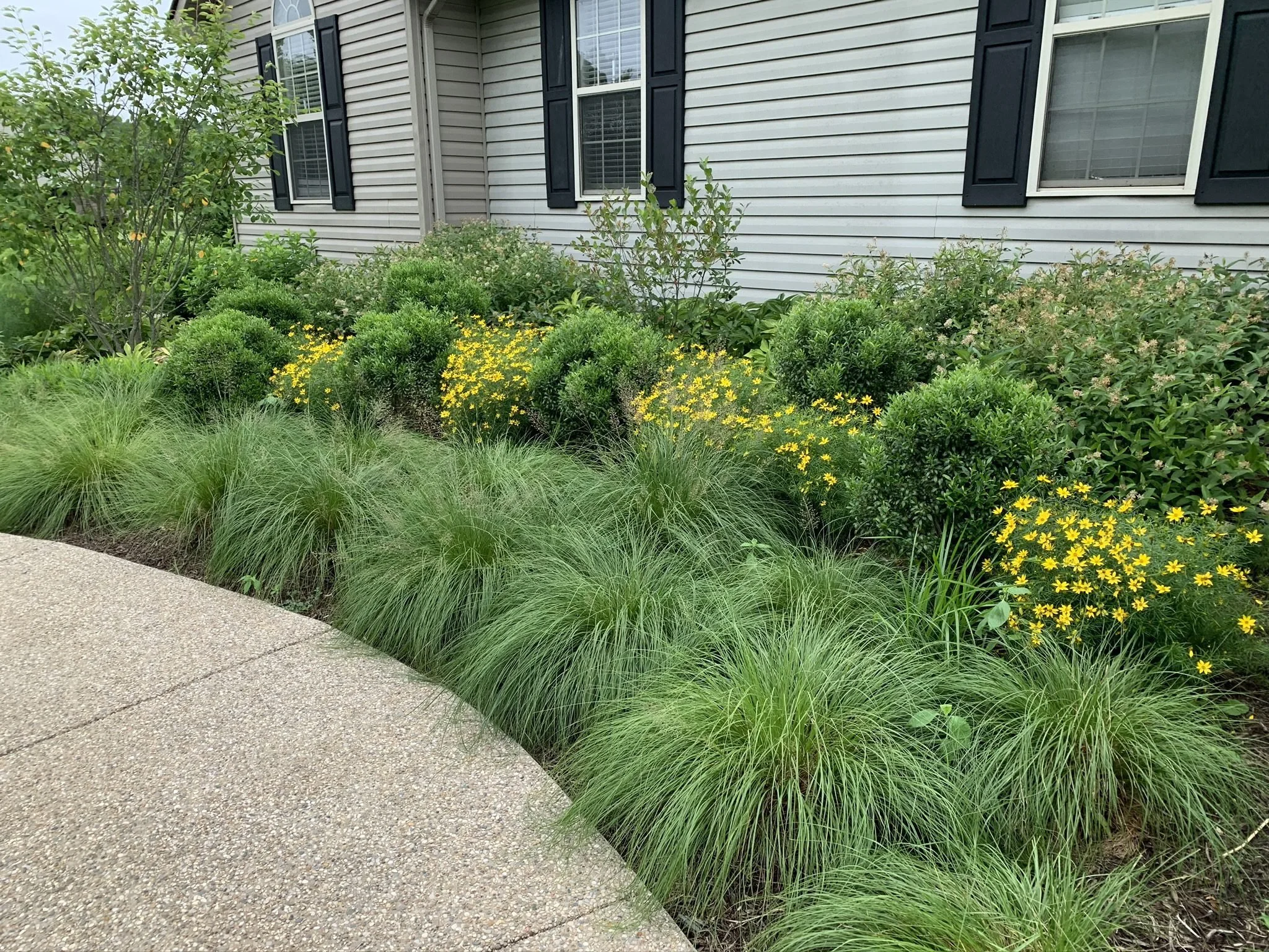 Native prairie dropseed, coreopsis, New Jersey team, chokeberry and serviceberry provide a food source for insects and deep root systems.